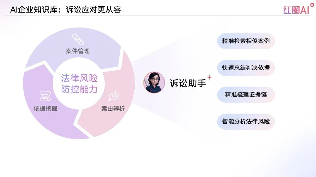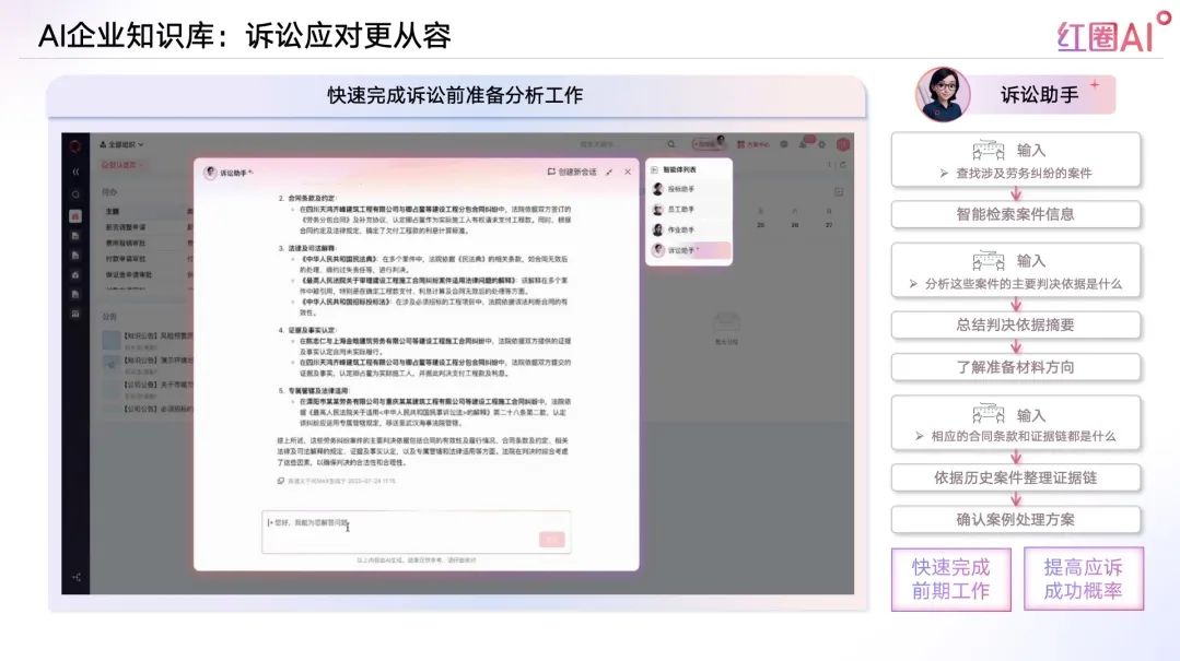 面對工程糾紛突發性強、資料復雜的挑戰,紅圈AI構建訴訟智庫,協助法務快速調閱判例、合同、律師函、內部分析等核心資料,高效支撐應訴與風險防控。