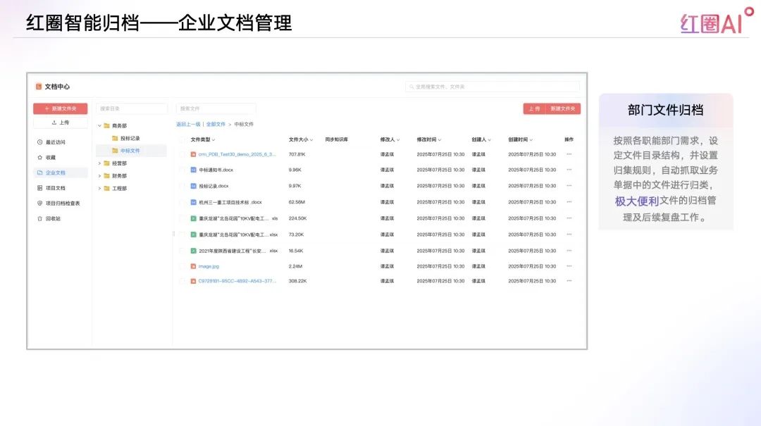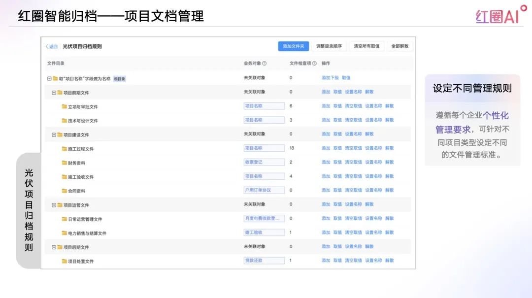 按照各職能部門需求,設定文件目錄結構,并設置歸集規則,自動抓取業務單據中的文件進行歸類,極大便利文件的歸檔管理及后續復盤工作