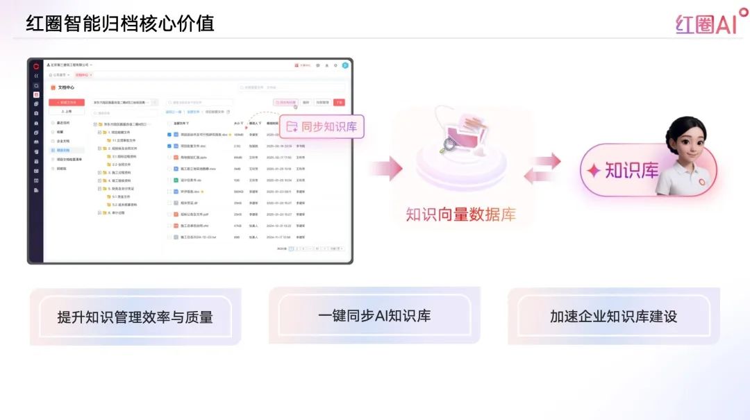 通過精準分類、統一歸集、秒級同步,紅圈AI幫助企業在最短時間、最低成本內構建企業級知識體系,實現知識管理智能化、資產化、標準化。