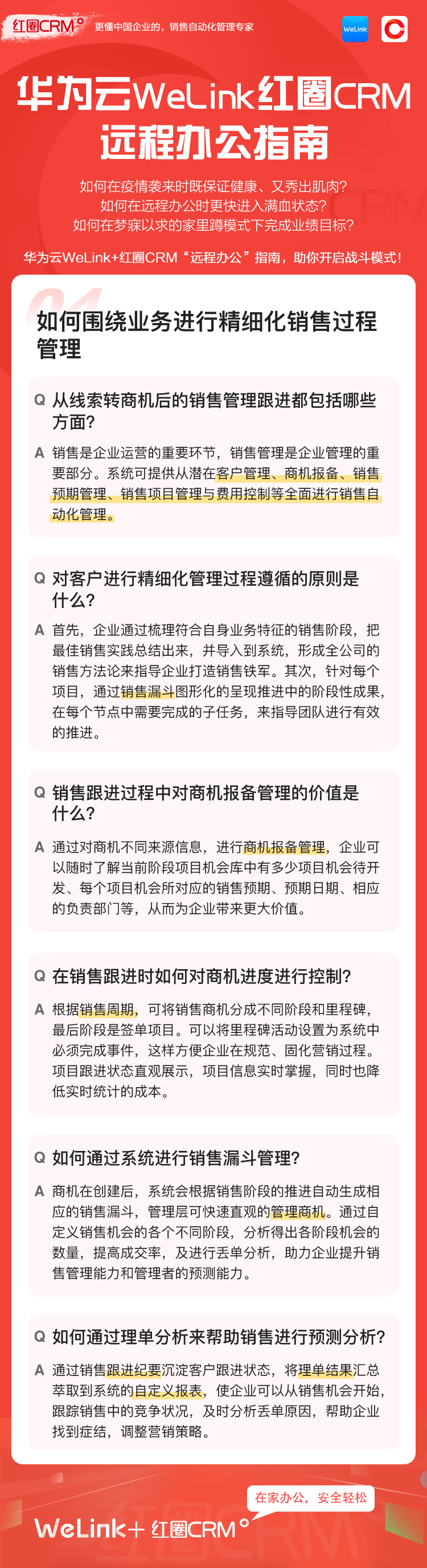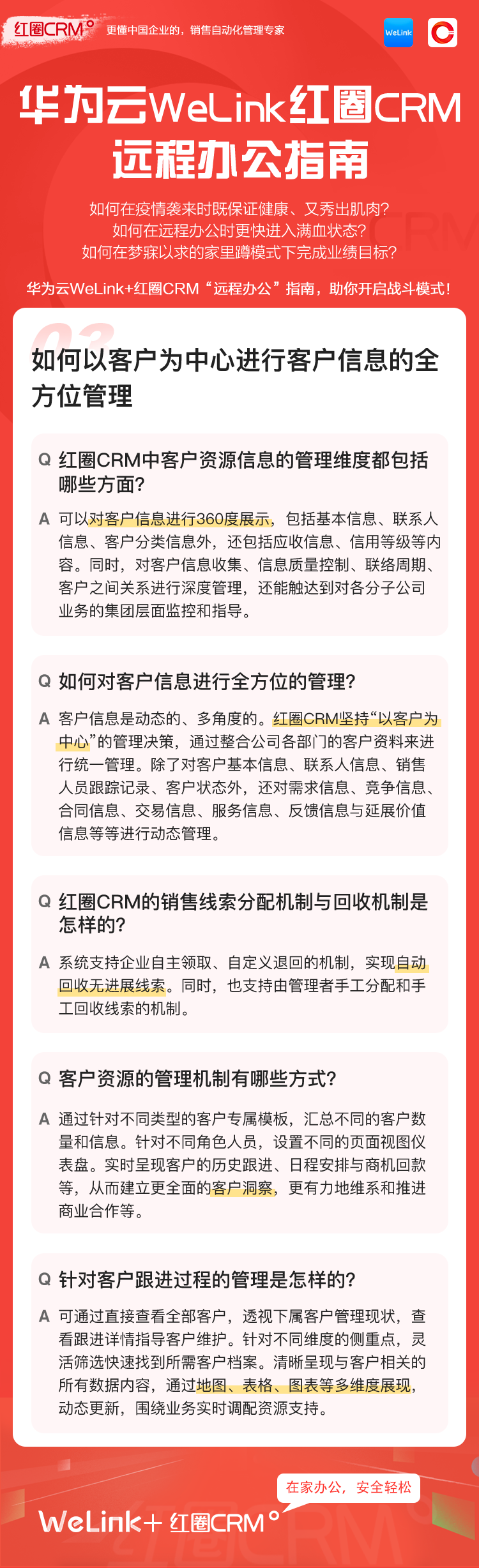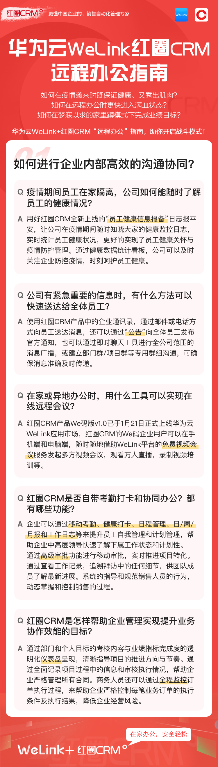 如何讓在家辦公安全、輕松、高效?華為云WeLink攜手紅圈CRM提供了安全、智能、開(kāi)放的移動(dòng)辦公解決方案,并提供免費(fèi)的在線視頻會(huì)議服務(wù),請(qǐng)您收好這份遠(yuǎn)程移動(dòng)辦公寶典!