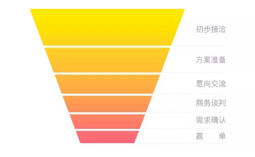 舉個例子,健康的銷售漏斗應(yīng)該是上圖這樣的,各階段的轉(zhuǎn)化率比較均勻,如果漏斗在中間某一段突然收窄,可能是在業(yè)務(wù)推進的某個階段出現(xiàn)了瓶頸,這時企業(yè)需要結(jié)合產(chǎn)品的銷售周期等因素,尋找漏斗“阻塞”的原因,及時做出調(diào)整。