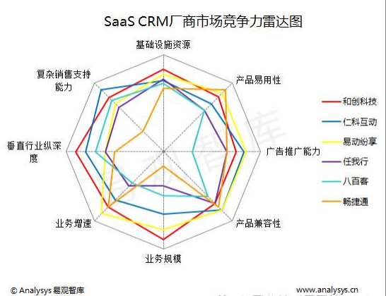 基于易觀智庫SaaS CRM市場上下游渠道獲得的相關業務經營數據以及與業內資深人士(2位公有云IaaS企業資深人士和8位SaaS CRM企業資深人士)的深入交流,易觀智庫系統分析了包括和創科技、仁科互動、易動紛享、八百客、任我行和暢捷通在內的六家供應商,對每家供應商都進行了客觀的評價,也對未來可以改進的地方給出了中肯的建議。