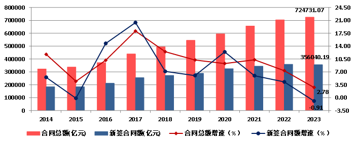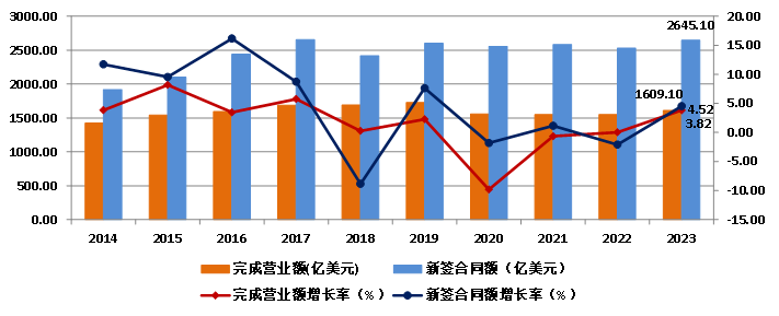 2023年,我國對外承包工程業務完成營業額1609.1億美元,比上年增長3.83%,新簽合同額2645.1億美元,比上年增長4.52%(圖14)。