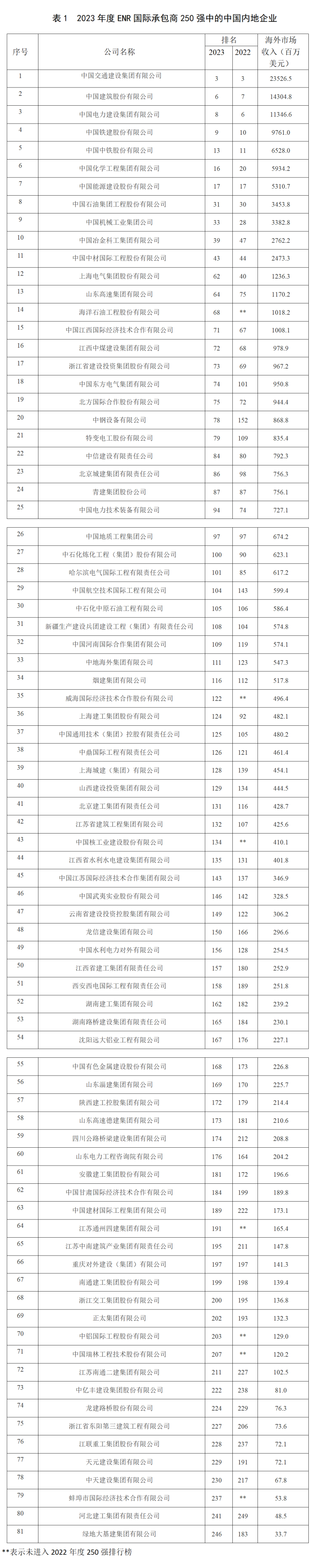 在 2023 年度國際承包商 10 強中,中國內地仍保持 4 家企業的記錄,分別是保持季軍的中國交通建設集團有限公司,排名前進到第 6 位的中國建筑股份有限公司,排名第 8 位的中國電力建設集團有限公司,以及排名前進 1 位來到第 9 位的中國鐵建股份有限公司。進入2023年度國際承包商百強榜中的內地企業有27家,數量較上一年度增加1家;新入榜內地企業有7家,排名上升的有35家,其中升幅最大的是中鋼設備有限公司,排名前進74位排在了第78位(表1)。
