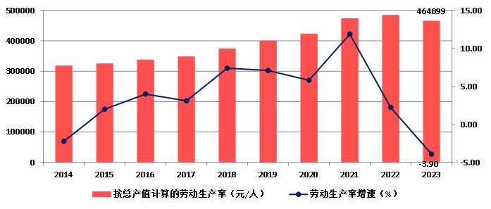2023年,按建筑業總產值計算的勞動生產率為464899元/人,比上年下降3.90%,增速比上年降低6.14個百分點,增速連續兩年下降(圖8)。