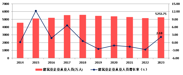 2023年,建筑業從業人數5253.75萬人,比上年末增加112.15萬人,增長2.18%,結束了連續三年減少的態勢(圖6)。
