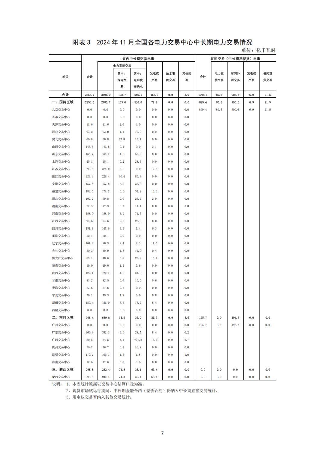 分區域來看,1-11月,國家電網區域各電力交易中心累計組織完成市場交易電量42715.9億千瓦時,同比增長7.1%,其中北京電力交易中心組織完成省間交易電量合計為10465.1億千瓦時;南方電網區域各電力交易中心累計組織完成市場交易電量10424.4億千瓦時,同比增長23.2%,其中廣州電力交易中心組織完成省間交易電量合計為2442.4億千瓦時;內蒙古電力交易中心累計組織完成市場交易電量2889.4億千瓦時,同比增長7.4%。